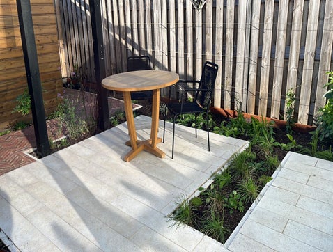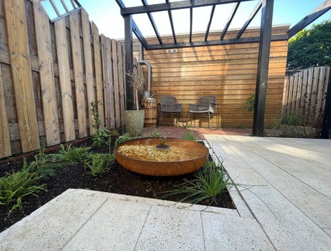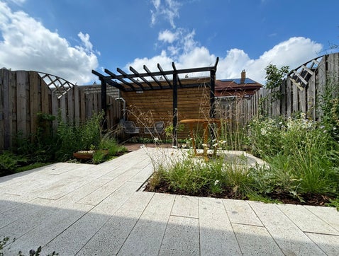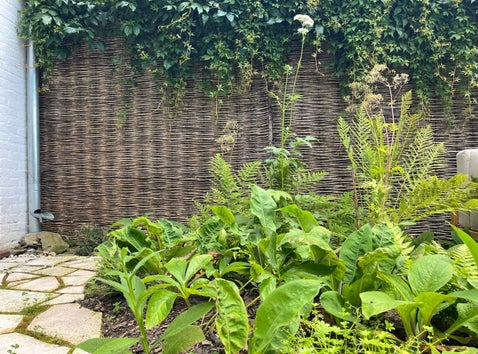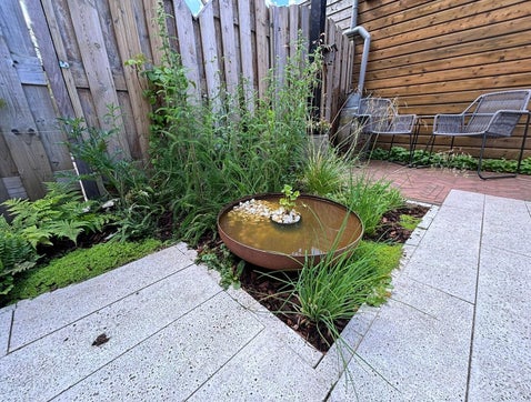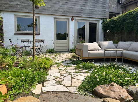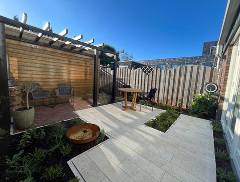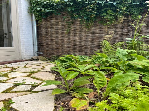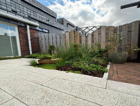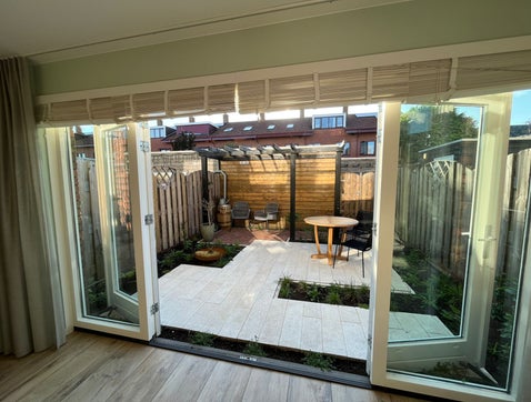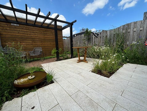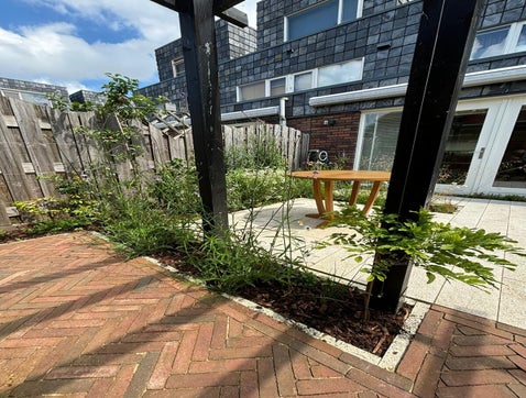 Een kleine stadstuin met een moderne uitstraling passend bij het interieur van de bewoners. Ja zeker, een moderne tuin kan ook ecologisch worden ingericht! Lange betontegels en klassieke hergebruikte klinkers in visgraatmotief geven een mooi contrast. Een zwarte pergola met blauwe regen, een inheems bloemenweidedak op de schuur, regenton, waterschaal, klimmers op de schutting en inheemse en eetbare beplanting passen allemaal in dit kleine tuintje! Er is gebruik gemaakt van duurzame en mileuvriendelijke materialen en de voegen zijn waterdoorlatend. Aangelegd in juli 2023. In kleine tuinen is de hoeveelheid verharding relatief wat groter, een groen dak is dan ideaal om de hoeveelheid groen te vergroten naast dat het nog veel meer voordelen heeft!
