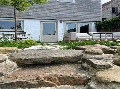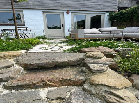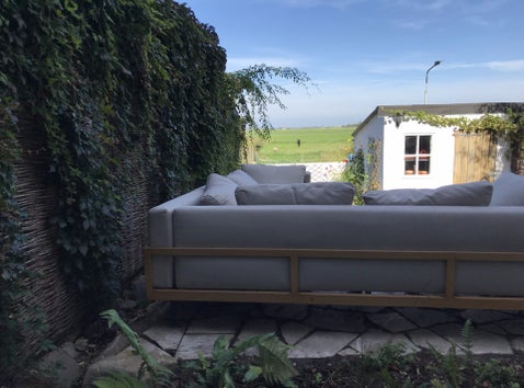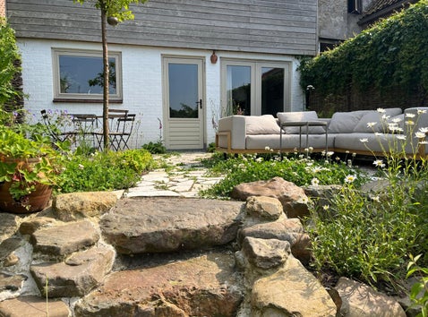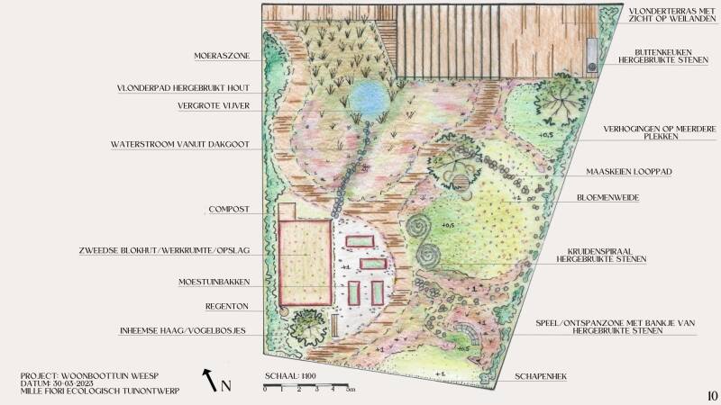 Een tuin met een verhoging en dus twee verschillende afdelingen. Om de tuin meer te openen is er een aflopend talud gemaakt van maaskeien en natuursteen. De tegels zijn restpartijen natuursteen waarvan de voegen zijn ingezaaid en beplant. Kruidenspiraal van overgebleven maaskeien. Water wordt slim gebruikt door de regenpijp vanaf het dak af te koppelen met een regenwaterklep, welke uitkomt in een stroompje met infiltratie in de border en verder naar een regenwaterpoel/wadi/swale. Eetbare en inheemse beplanting met veel waardplanten. Ook een wilgenschutting en boomschors in de moestuin, welke in de loop der tijd meer een voedselbos zal worden met vaste planten.