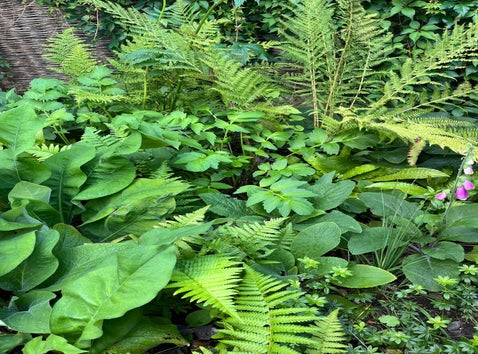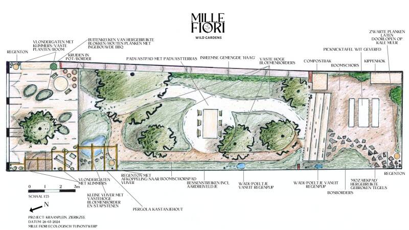Deze lange en smalle stadstuin kijkt uit op een hoge blinde muur aan de rechterkant. Dat probleem is opgelost door meerdere bomen en klimplanten tegen de muur te plaatsen. De vlonder aan het begin was al aanwezig, hier komen meerdere ongelijke open cirkels in waardoor het groen veel dichter bij huis komt, en de tuin meer betrokken wordt bij het huis. Ook komt er een kastanje pergola welke de tuin met het huis verbindt en een deur in de muur minder opvalt. Een kronkelend paadje van padvast met er tussen hoge bloemenborders waardoor er tussen het groen gezeten kan worden en de tuin nog meer de hoogte in gaat. Een boomschorspaadje leidt langs een eetbare rand van bessenstruiken en aardbeien. Achterin ga je via het bestaande houten trapje naar een lager gelegen bosgedeelte, waarin kippen lekker kunnen rondscharrelen en je in de zomer heerlijk koel zit. Een vijvertje zorgt voor nog meer beleving en leven in de tuin Verder zijn er uiteraard veel inheemse en waardplanten te vinden, worden er tegels hergebruikt, regentonnen en een compostbak geplaatst en water afgekoppeld in kleine wadi's. Binnenkort meer foto's van het eindresultaat!